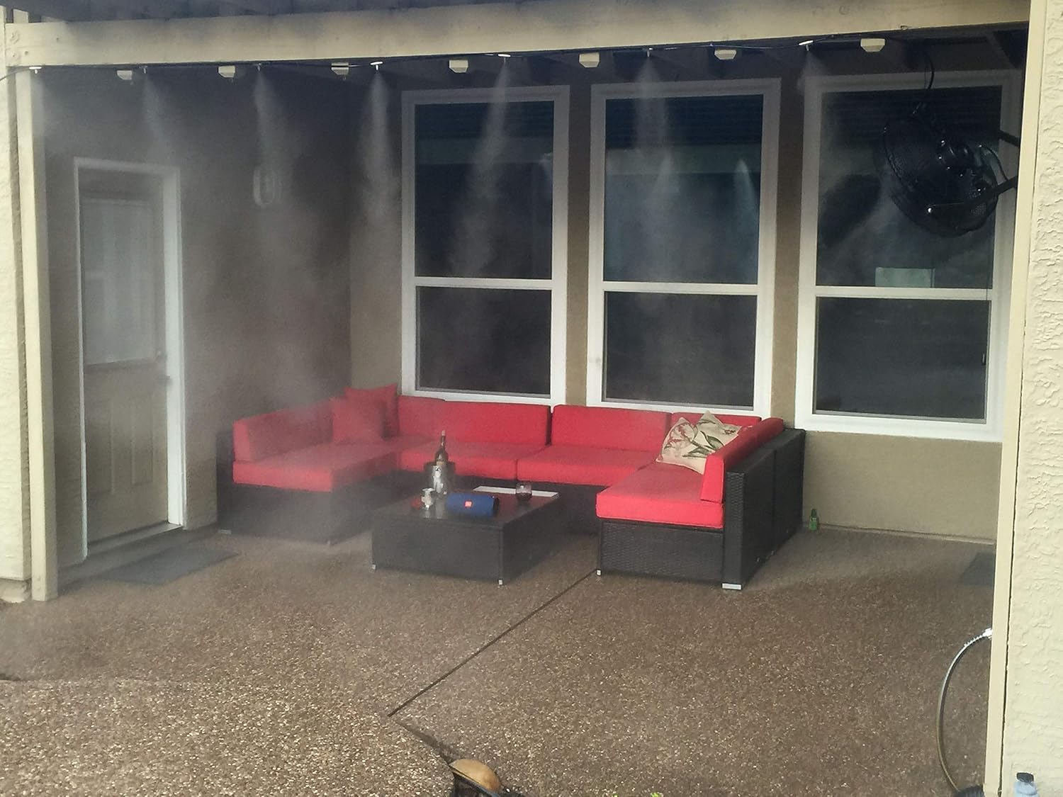 - MULTIUSE COOLING FAN KIT: Enjoy a very good cooling and humid effect and environment. Perfect for Greenhouse, landscaping; humidified courtyard, lawn garden landscape, pool side, dry cleaners, mechanic bays and outdoor restaurants. Installed in the courtyard, can cool the surrounding temperature.