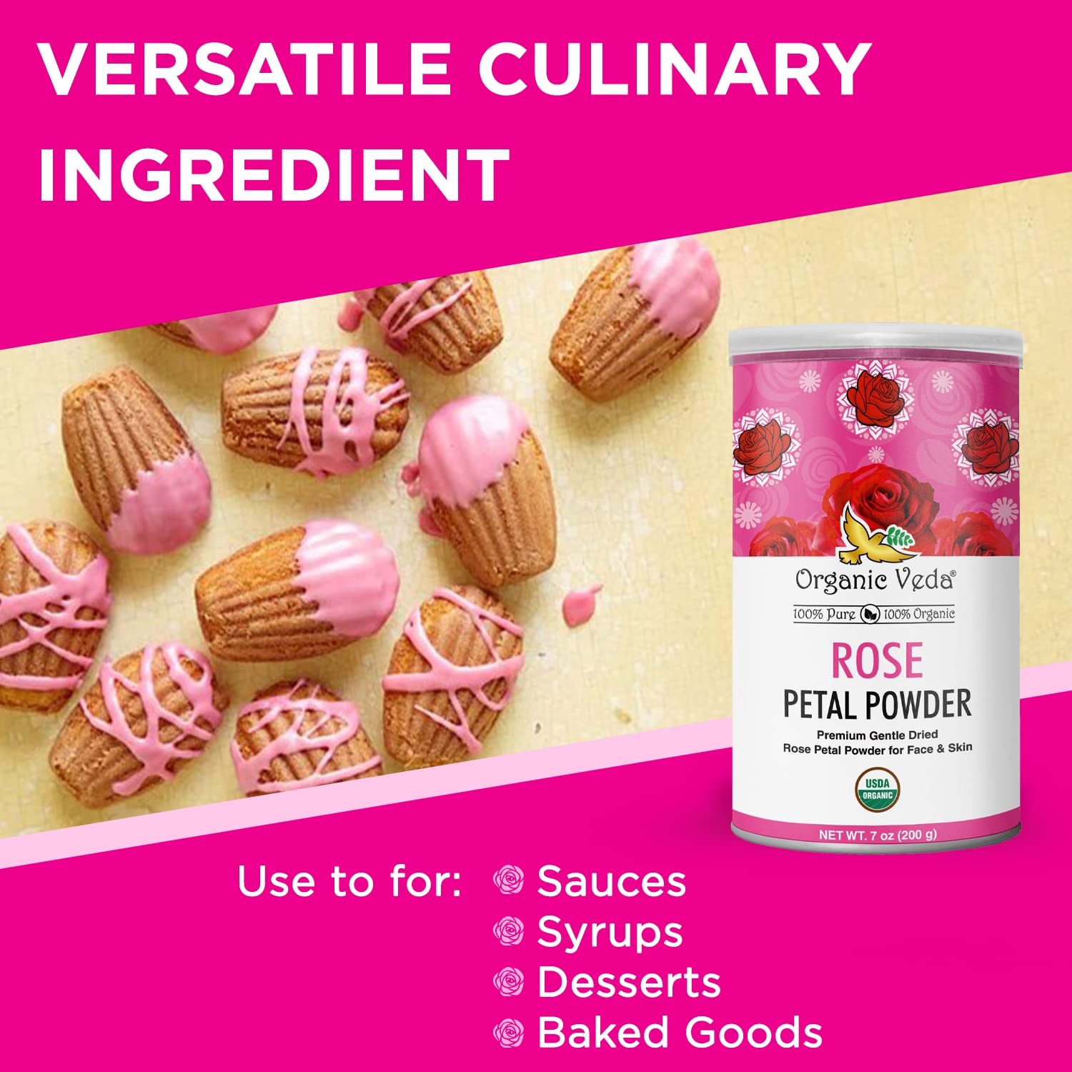 Organic Veda Edible Rose Petal Powder - Organic Rose Petal Powder for Cooking, Herbal Tea, Smoothies, Toppings - Natural Rose Petal Powder for DIY Face Masks, Skin, Hair Care - Vegan, No Gluten - 16oz