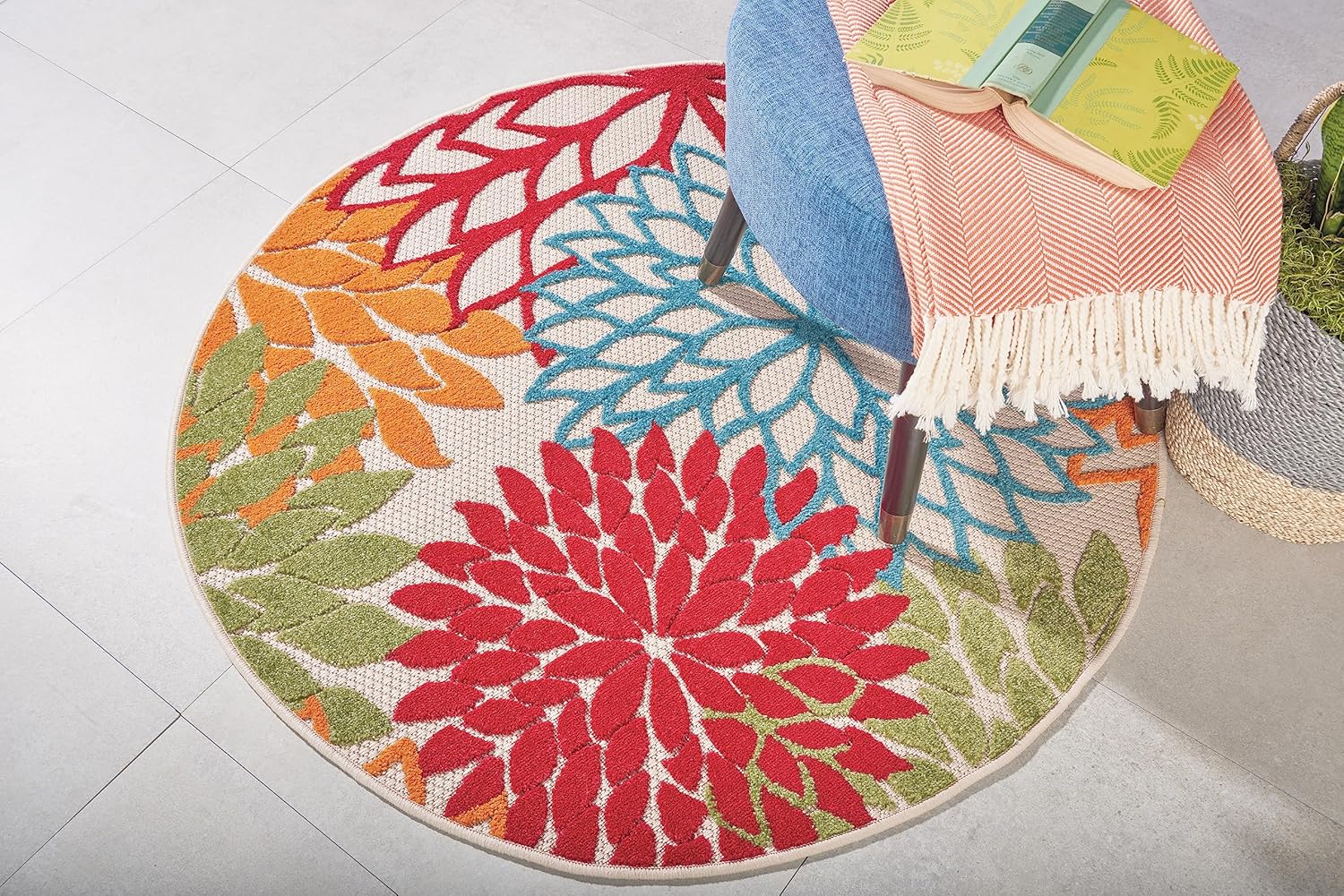 Nourison Aloha Indoor/Outdoor Green 5'3'' x Round Area-Rug, Tropical, Botanical, Easy-Cleaning, Non Shedding, Bed Room, Living Room, Dining Room, Deck, Backyard, Patio (5 Round)