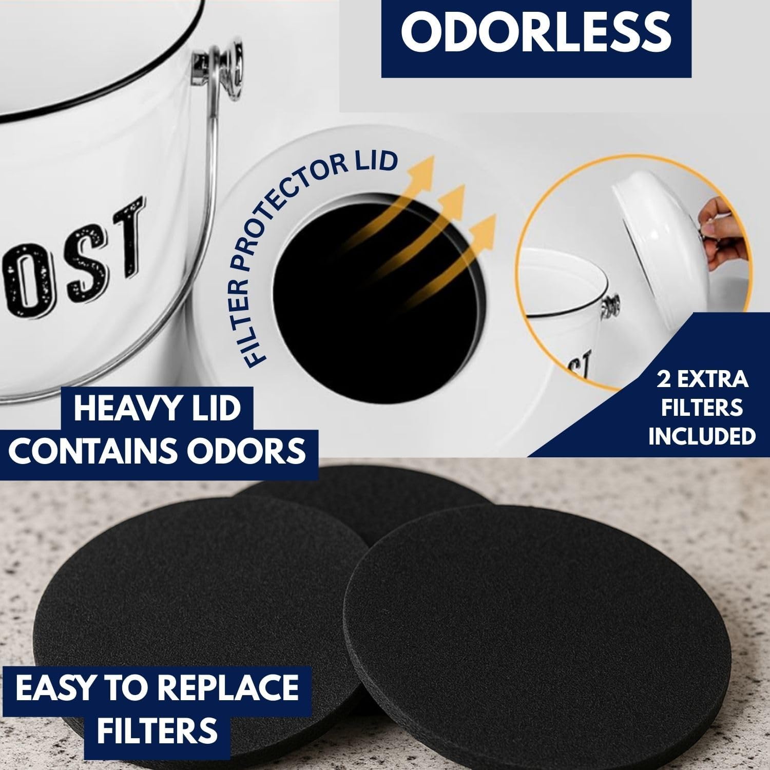 - HIGH-GRADE CHARCOAL FILTERS: In addition to the built-in charcoal filter you will receive 2 extra filters for the kitchen compost bin - each filter lasts about 3-4 months; keep your kitchen smelling fresh with the indoor countertop compost bucket.
