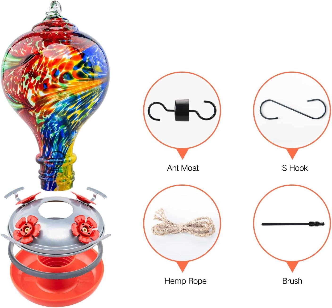 - CONVENIENT TO USE: bird feeder including user manual,1 ant moat, 1 S hook, 1 hemp rope (to hang the bird feeder), and 1 brush (to clean the feeding hole). Easy to assemble, fill, and clean.
