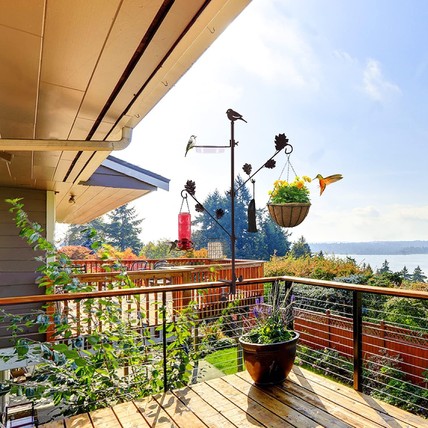 Urban Deco Deck Pole Porch Multi-Hook Bird Feeder Hooks for Deck Kit with Feeder Polyester and with 2 Adjustable Branches and Plastic Water Bowl