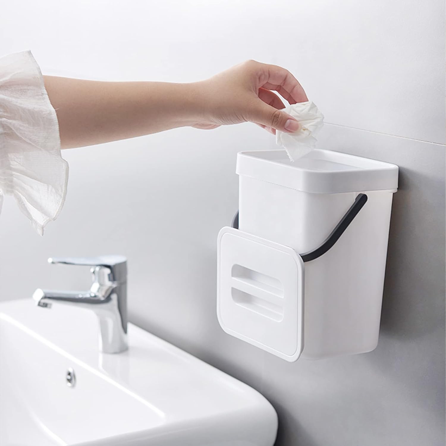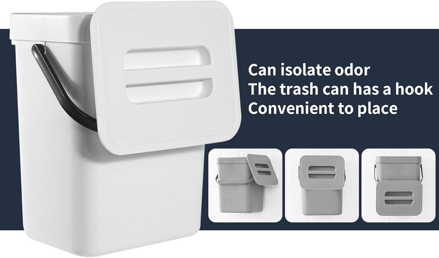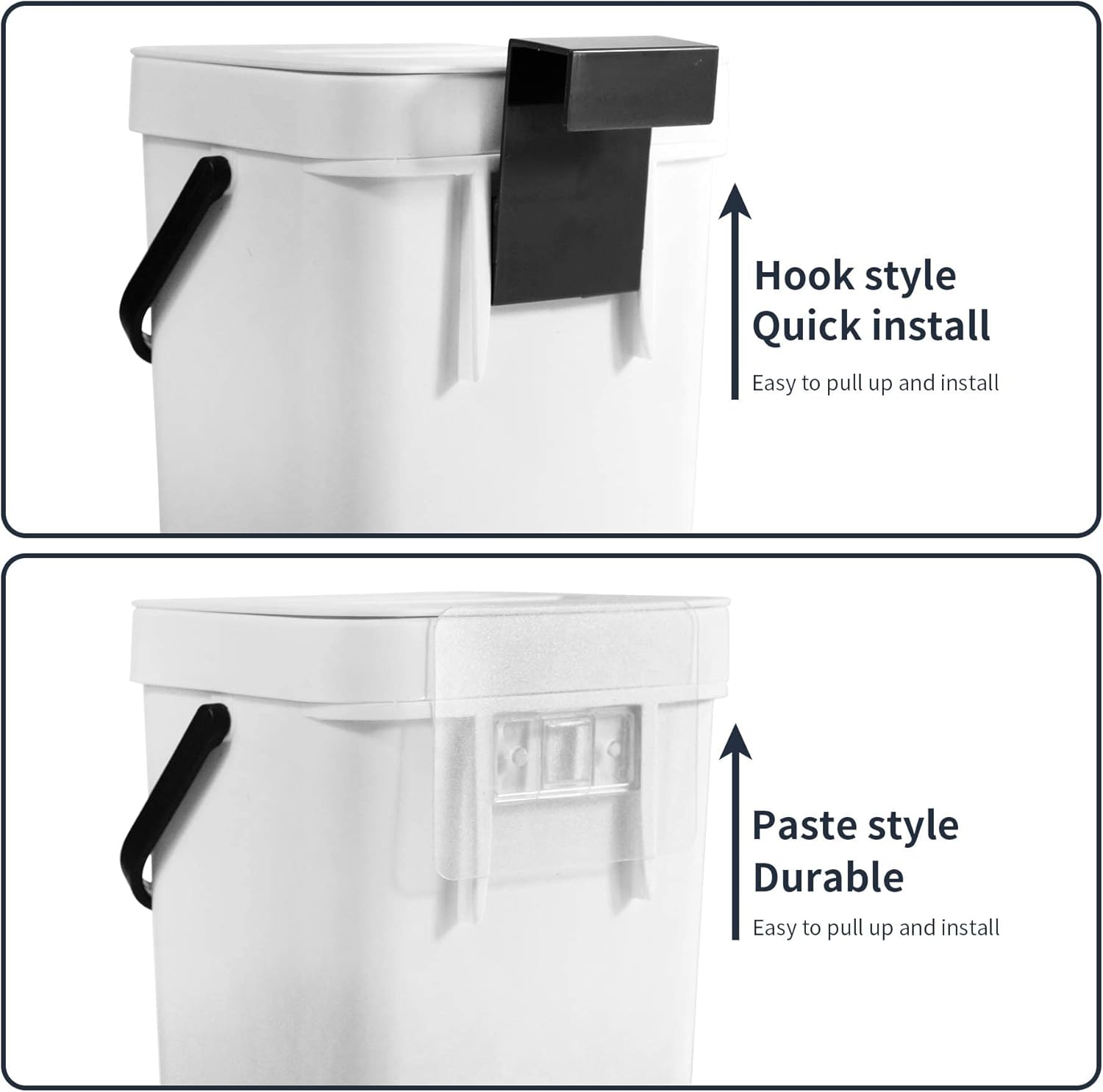 - Hangable and Mountable: The small trash can with lid can be easily hung on the doors of kitchen cabinets, office lockers or bedroom drawers. Moreover, this food waste caddy can also be wall-mounted to your cupboard, kitchen wall or bathroom wall with adhesive pad.