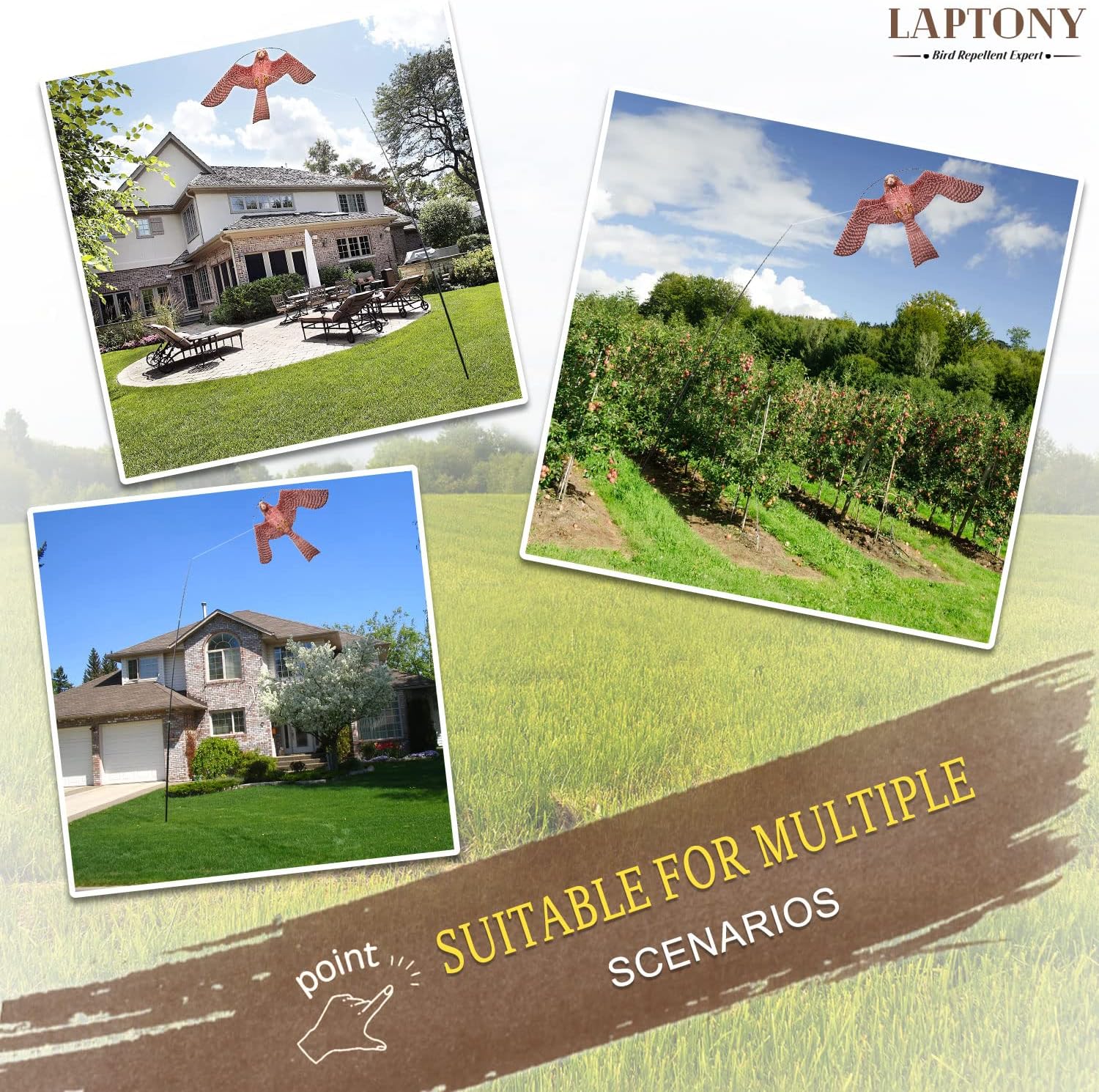 - HOW BIRDS SCARER WORKS: The vibration generated by the bird scarer kite's wings in the wind, as well as the dynamic behavior of flying with the wind, the realistic patterns and colors, have the effect of scaring the birds, without causing them harm. It can protect farmland, Gardens, orchards