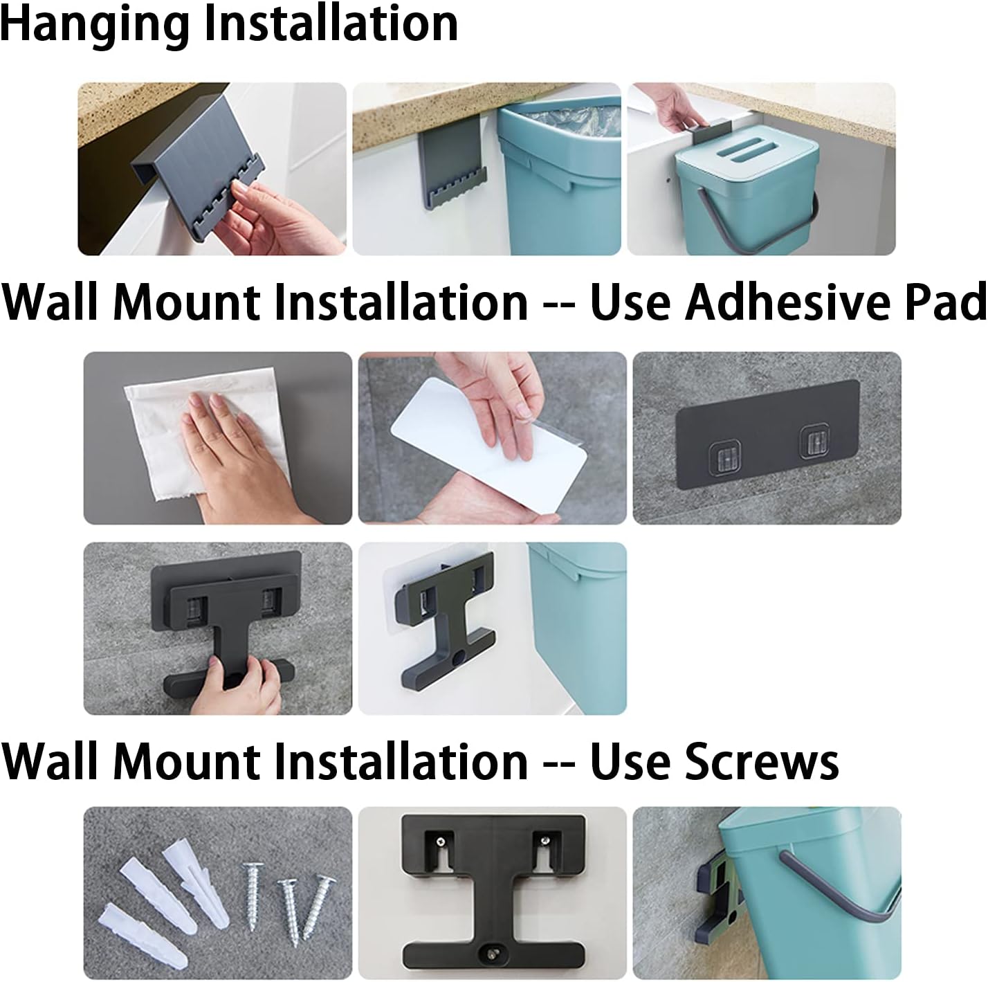 - Two Installation Options : Our kitchen trash bin can easily hang on the cupboard door with mount accessory included.It also can be hung on the wall by adhesive tape.You can use it as an under sink kitchen trash can, a wall-mount trash can, a countertop compost bin.