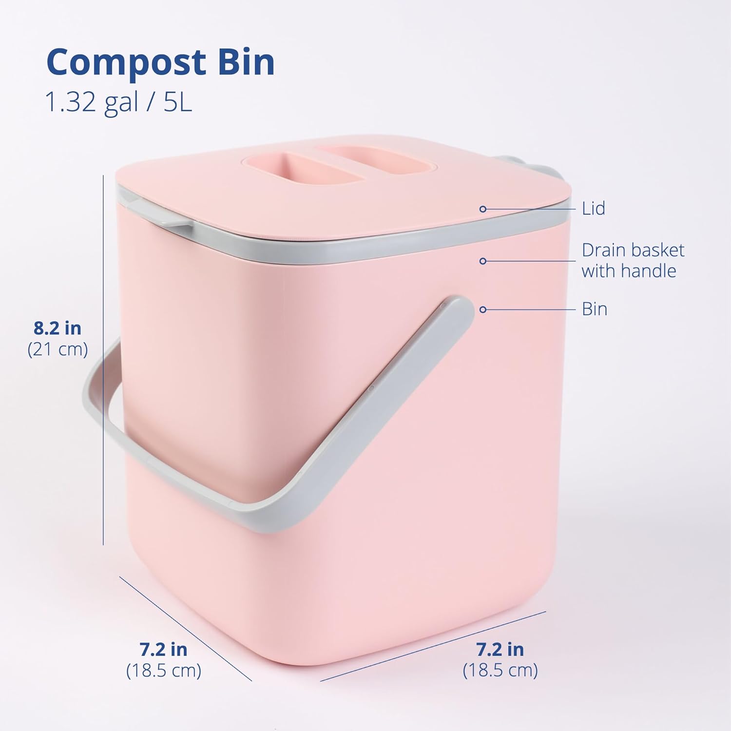 - AVAILABLE IN TWO SIZES - This compost bin is perfect for a 4-person household. It has a capacity of 1.32 gallons or 5 Liters and the outer dimensions measure W7.2 x H8.2 x D7.2 inches.