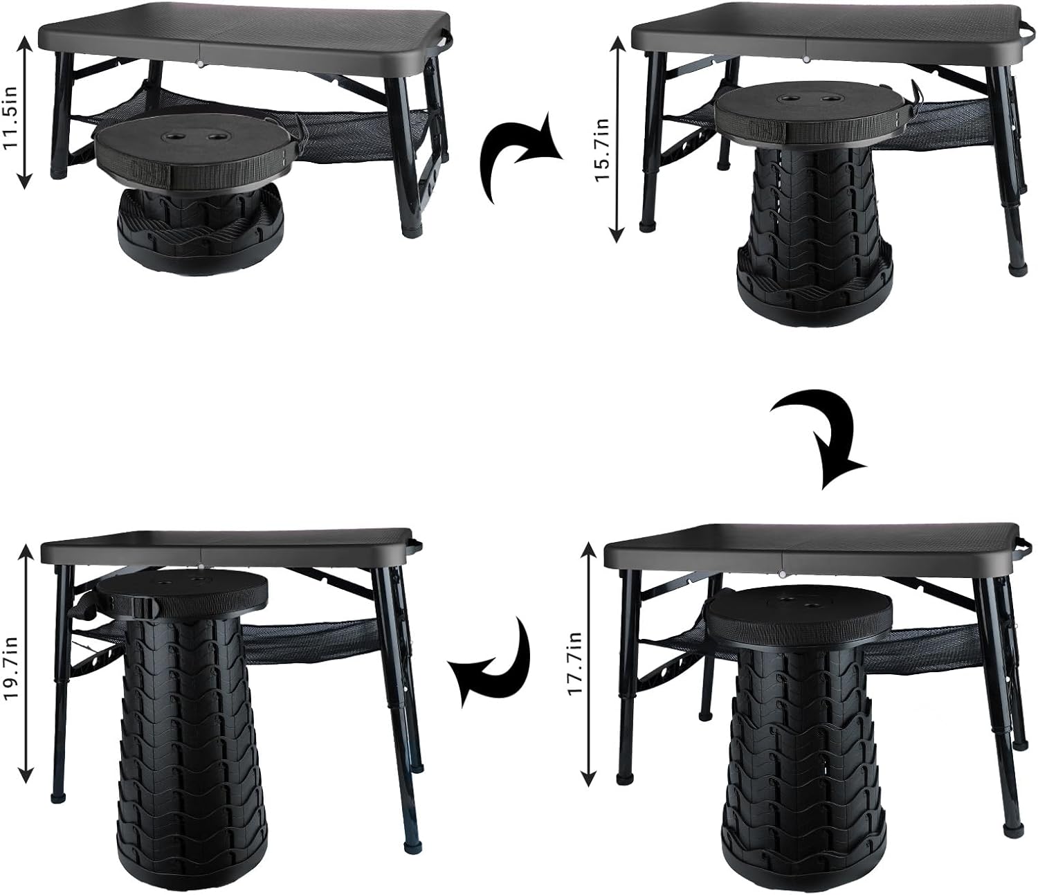 - Adjustable Height And Scene Application: The height of the small folding table 4 foot can be adjusted to 11.5in, 15.7in, 17.7in and 19.7in, and the height of the telescopic stool can be adjusted from 2.36 to 18.11 inches. Great for indoor and outdoor scenes. Outdoor: Camping Table, Travel Table, Beach grill Table, Patio Table, Folding Picnic Table,Folding Card Table; Indoor: Bed Table Tray, Office Desk
