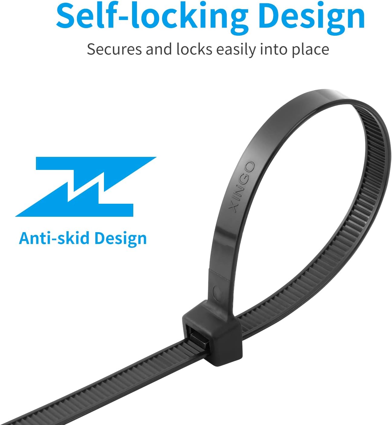 - ★【Self-Locking Desgin】XINGO Self-Locking Zip Ties adopt humanized anti-return design, the tooth grooves are alternately overlapped to reach the locking position, and the teeth are not returned while fixing the self-locking, which can better fix the thing.