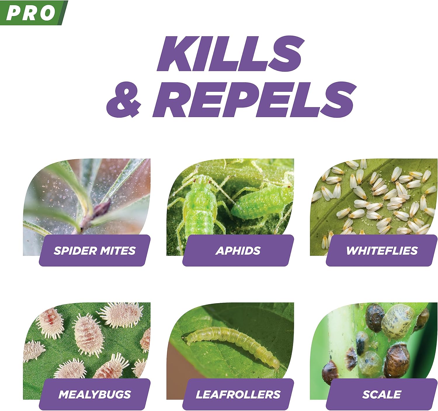 - KILLS AND REPELS INSECTS - Kills common soft-bodied insects including spider mites, two-spotted spider mites, aphids, whiteflies, mealybugs, leaf rollers, scale, thrips, pepper thrips and russet mites.
