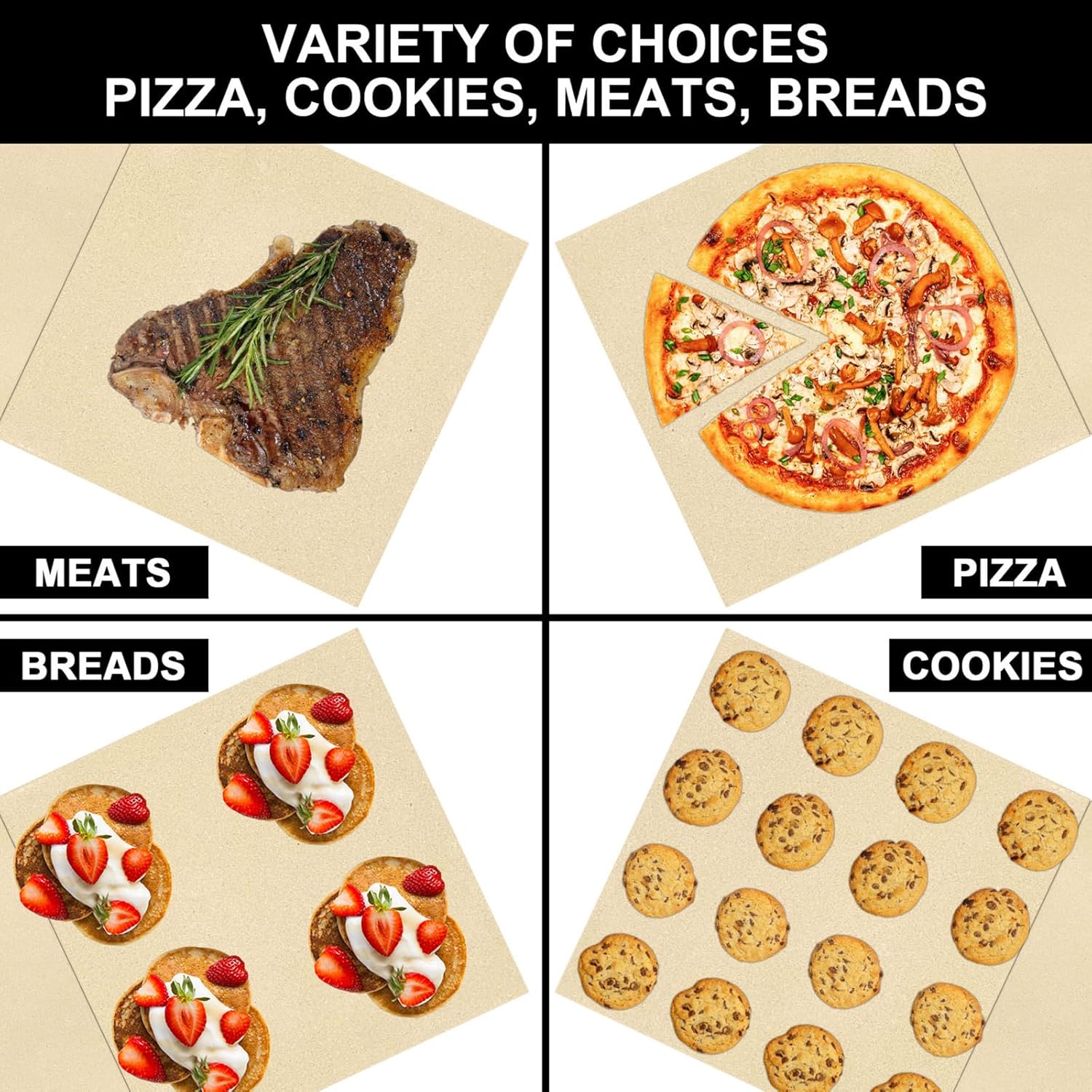 - Package contains two pizza stones (one T-shaped and one square). Square pizza stone measures: 16.7'' x 16.7''; T-shaped pizza stone measures: 16.7'' x 7.9''; Material: All natural Cordierite. Solid piece that cooks evenly. Can be used in home kitchens, family gatherings and parties. Can be used to bake bread, pizza, pies, cookies, and pastries, etc.