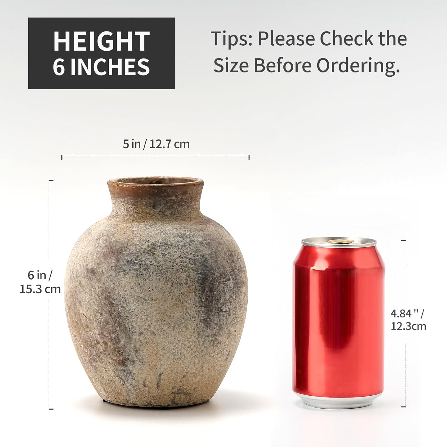 - ๐๐๐๐ฌ๐ฎ๐ซ๐๐ฆ๐๐ง๐ญ๐ฌ: The rustic vase measures 6" height and 5" width with 2.4" opening.Perfect for greenery and dry or faux florals,but also can hold water for fresh flowers.The vase itself can be displayed indoors or outdoor as a fine decorative piece.
