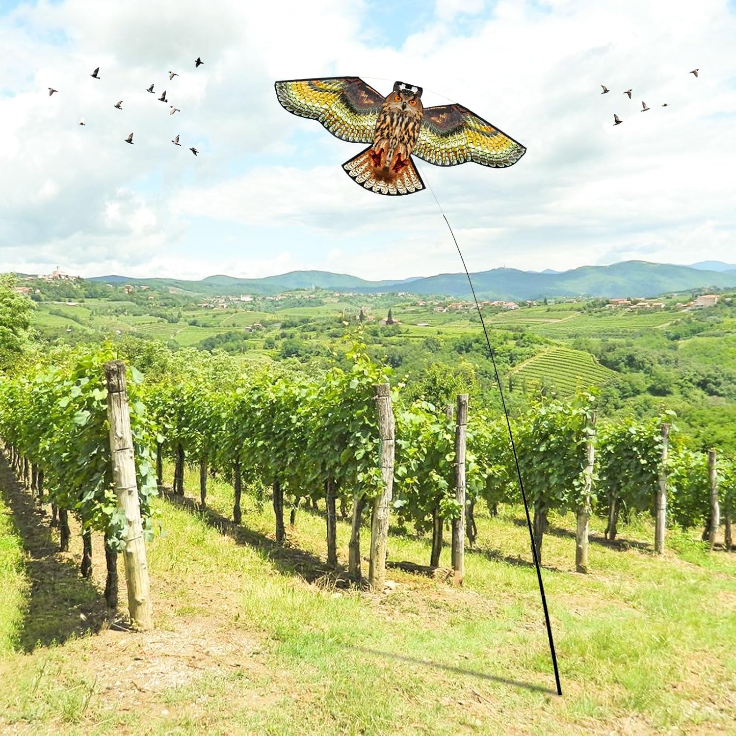 - COVER AREA AND APPLICATION: Our bird scarer kite valid cover area is 200-500 square meters. Protects buildings, balconies, allotments, seeded lawns and gardens, orchards, patios, vegetable gardens, farmyards and crops from flocking birds such as pigeons, starlings, seagulls and crops