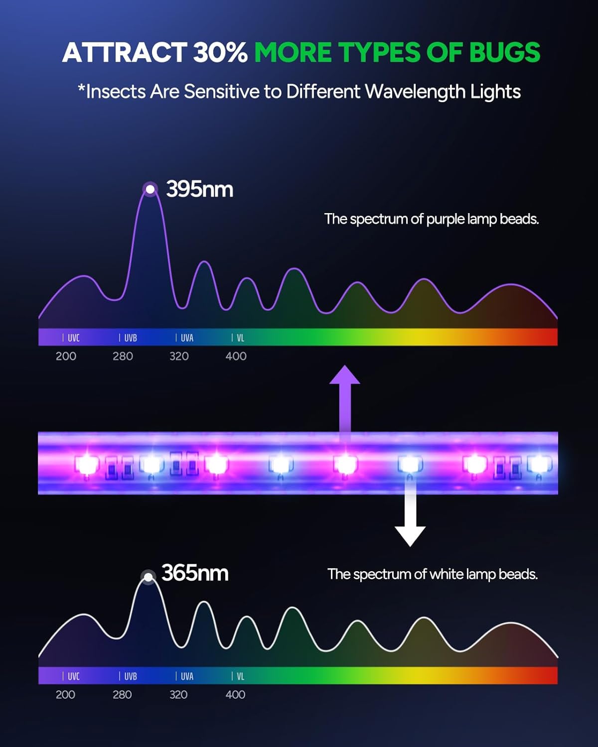 - Enhanced LED Attraction: The bug zapper uses a combination of two peak wavelength LED beads at 365nm and 395nm. Therefore, you will see two different colors of our LED beads. The dual-color LED system increases insect attraction by 30%, making it especially effective in low-light or nocturnal environments.(Recommended for use only in low light or darkness, as daylight or bright light reduces its effectiveness.)