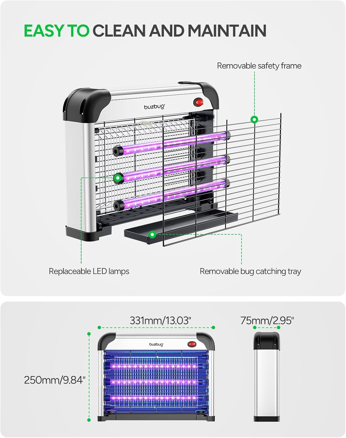 - Durable & Sustainable: At Buzbug, we are dedicated to creating a product that balances user experience with climate-friendly design. Our mosquito zappers utilize energy-efficient LED technology, significantly reducing power consumption without compromising performance. Additionally, with every purchase, we actively support carbon offset projects and reforestation initiatives, helping to ensure a green and sustainable future for everyone.