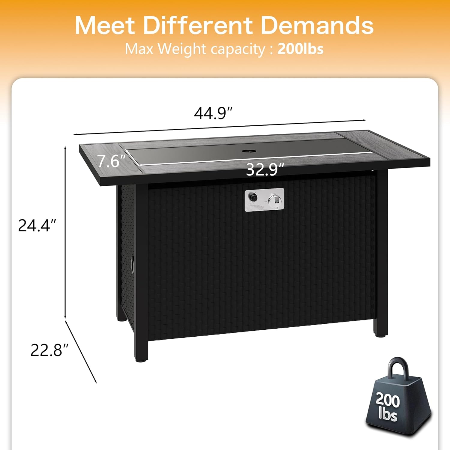 - WHAT YOU GET:The Rectangular gas fire pit measures 44.9"x 22.8"x 24.4" and weighs 88lbs. One delivery box contains one rectangular fire table, one removable anti-rust lid, red lava rocks and one instruction