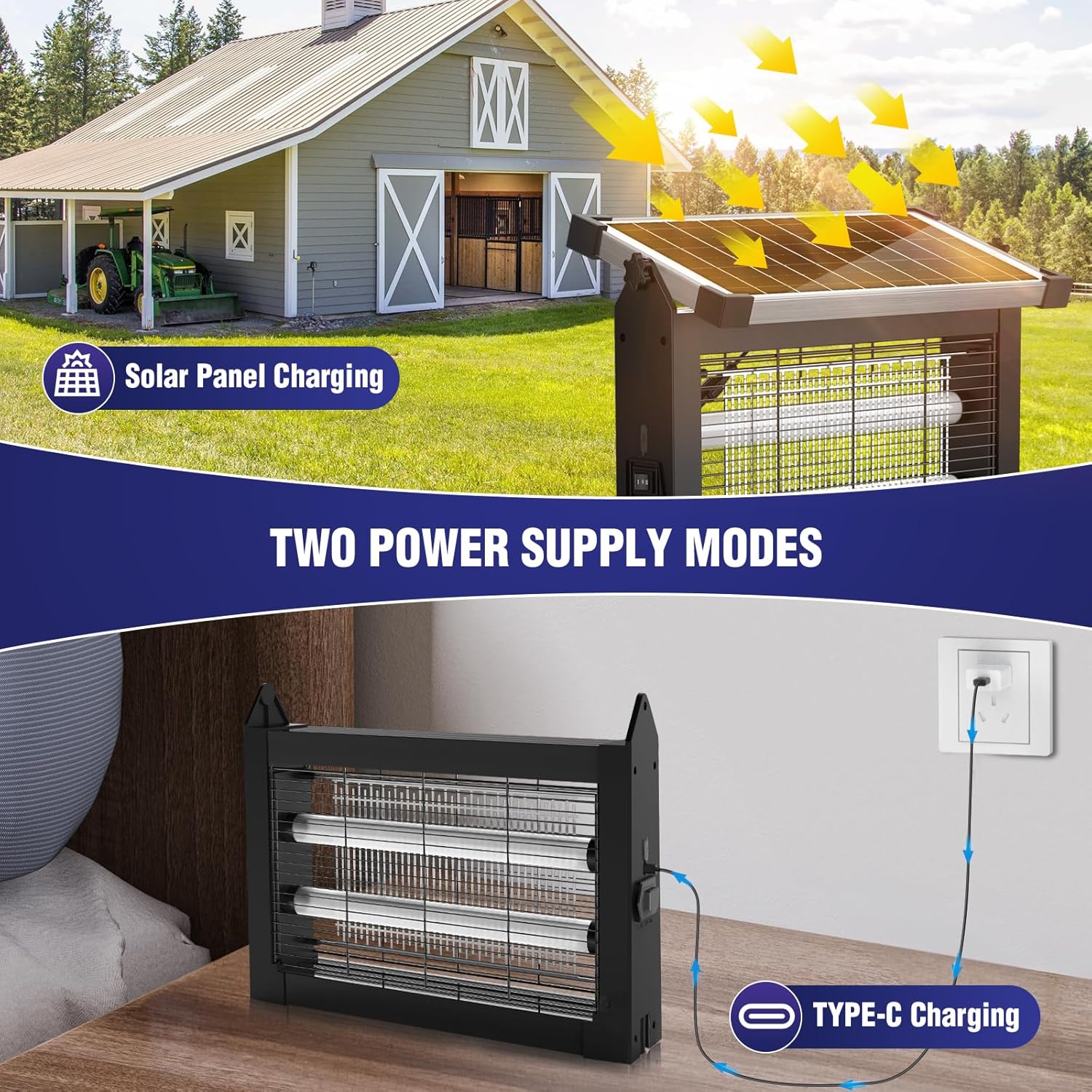 - Diverse Power Supply Options: The solar bug zapper outdoor is designed with three effective power supply methods: a 10 W 5V solar panel, a Type-C cable, and a rechargeable battery. The fly zapper's battery charges in 4-6 hours, with an indicator changing from red to green when fully charged.A single charge can last about 12 hours. Outdoor bug zapper features an adjustable solar panel for optimal light exposure. When using outdoors, cover the charging and switch ports to waterproof the device.