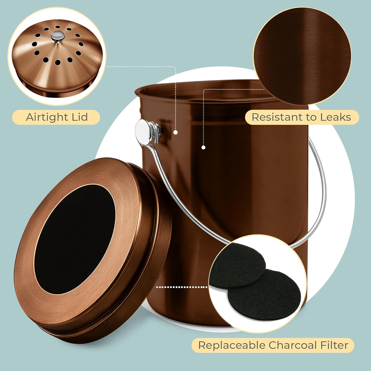 - EASY TO CLEAN & RESISTANT TO LEAKS: Our one-piece molded counter compost bin with lid, resists rust and leaks, making it easy to clean and maintain. Say goodbye to welded bins that deteriorate over time.