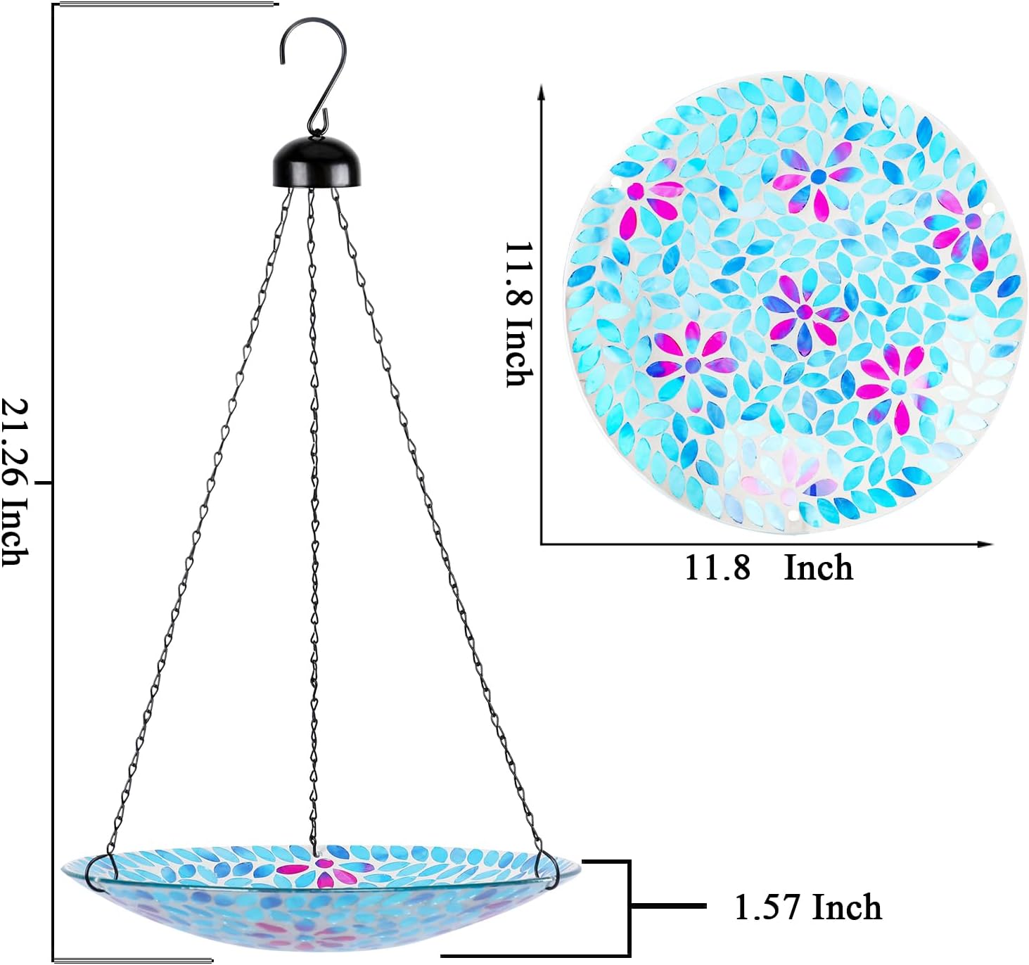 VCUTEKA Hanging Bird Bath, Glass Mosaic Bird Baths for Outdoors Birdfeeder with 21 inch Rust-Proof Chain for Garden Yard Decor, Flower