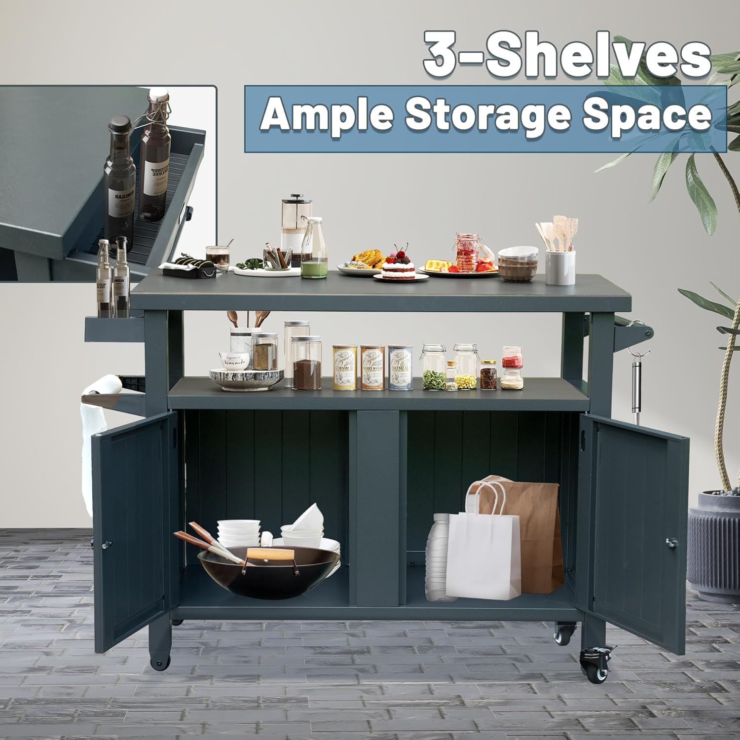 - Ample Storage Space - the outdoor grill prep cabinet table is designed with three-tie of the griddle stand which provide plenty of storage space. The open storage area offers 26 gallons, perfect for storing grilling tools and accessories. The enclosed cabinet provides 57 gallons of storage capacity, allowing for even more room for miscellaneous items