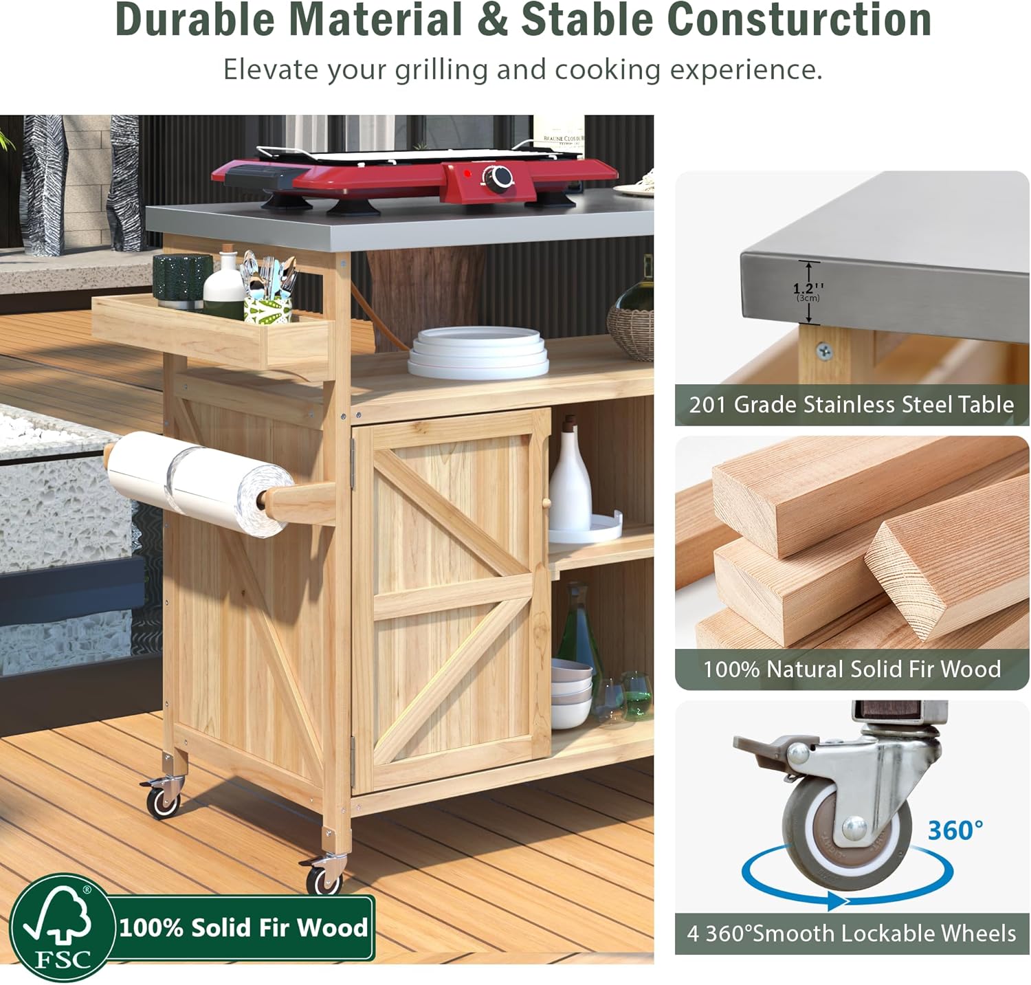- Heavy Duty Structure: Crafted from 100% exquisite fir wood and featuring a 1.2-inch thick 201 stainless steel tabletop, this outdoor grill cart is both durable and easy to clean. Its natural charm and minimal chemical coatings ensure a skin-friendly and long-lasting product, perfect for any outdoor setting.