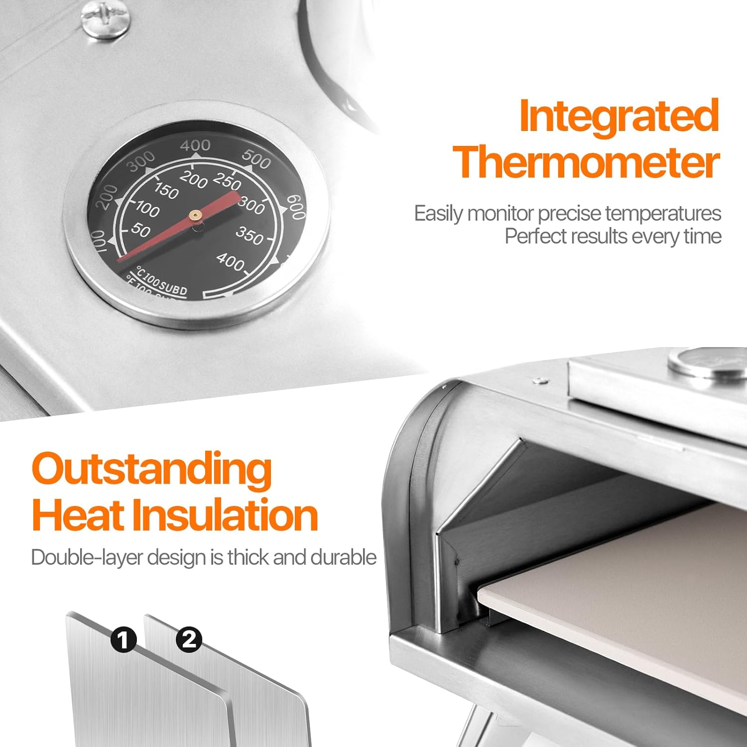 - Premium & Safe:The pizza oven is made of premium 430 stainless steel and cold rolled sheet metal for thickness and durability, this double insulated construction provides excellent heat retention and combines with the natural efficiency of wood fuel for an efficient cooking experience. The pizza oven is easy to operate, simply place the firewood in the oven, light the fire and start baking. It offers excellent safety from potential safety risks such as over-burning and excessive temperatures