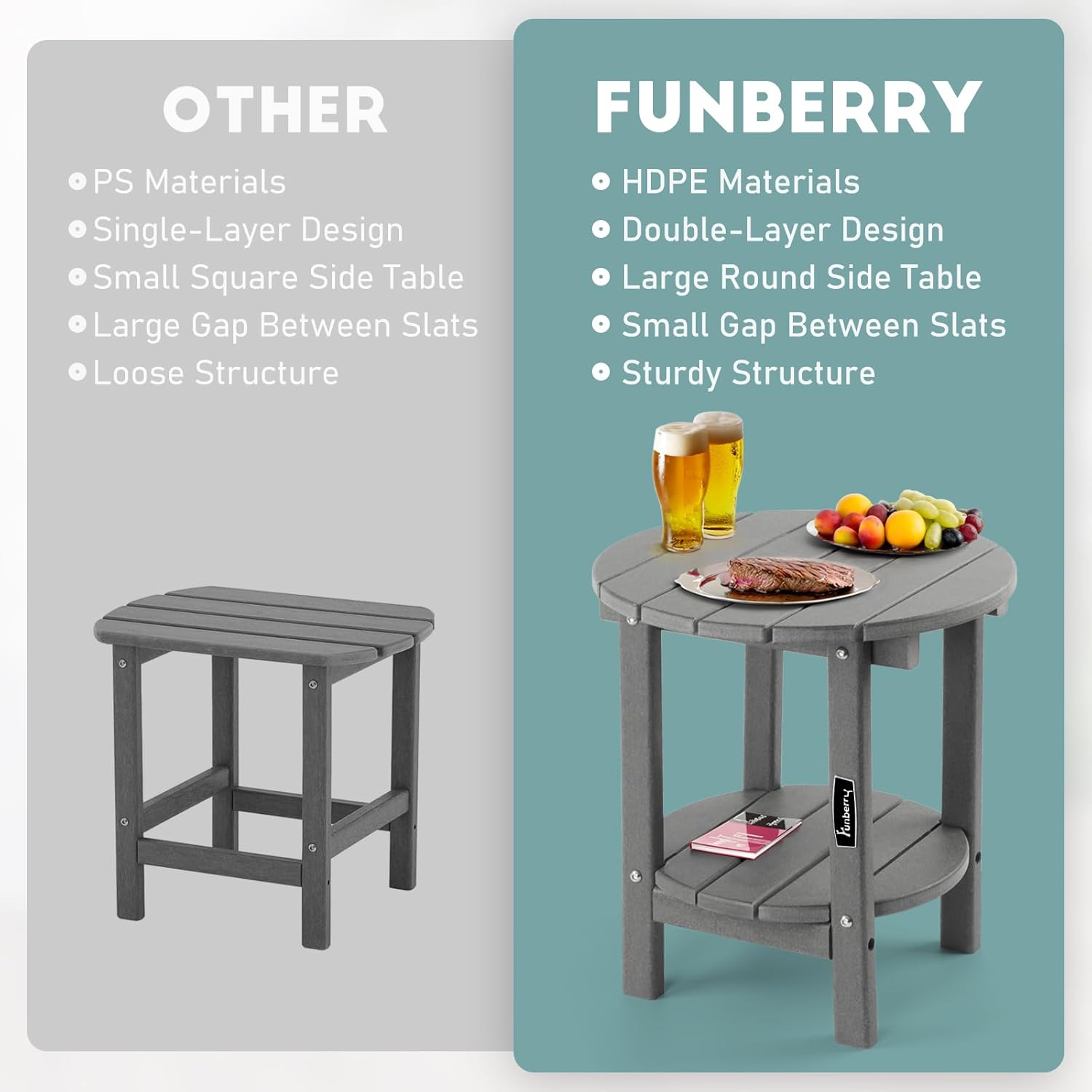 - Double Layers & Smooth Design: The 2-tier design of this outdoor side table provides more storage space for food, drinks, books and other items. The smooth edge design makes this patio table more safe especially for families with children. This patio side table is an ideal companion for Adirondack chairs, Rocking chairs and Chaise Lounge chairs.