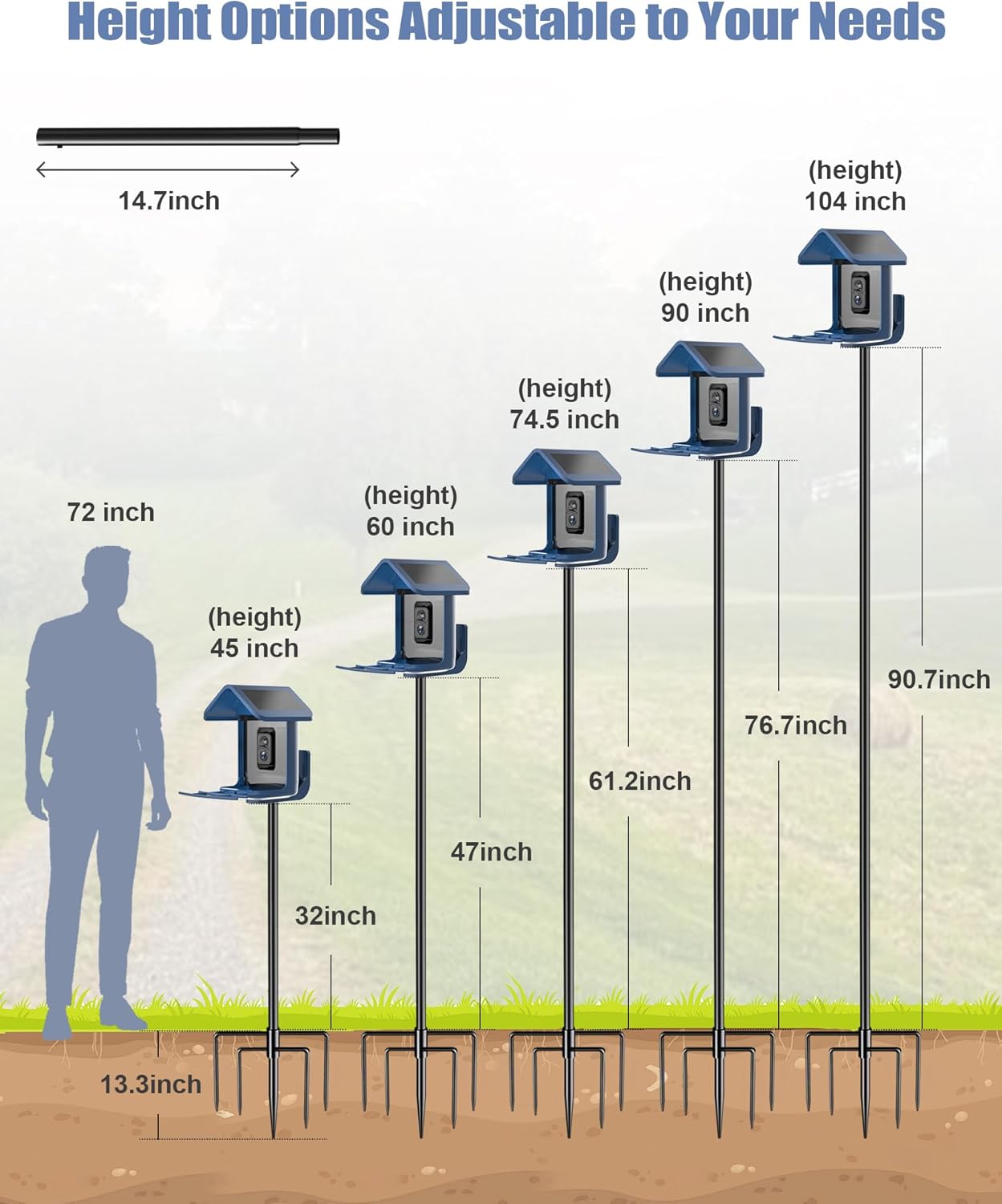 - 【Easy Installation】This bird feeding station reaches a total height of 74.4 inches and comes with 6.5-inch 5-prong base, 5x connecting pole, and an L-shaped plate. The slip-in connection method allows for easy assembly, similar to stacking building blocks. Installation typically takes 20 to 40 minutes and no need extra tools. This user-friendly design ensures that anyone, from young enthusiasts to seniors, can set it up effortlessly.