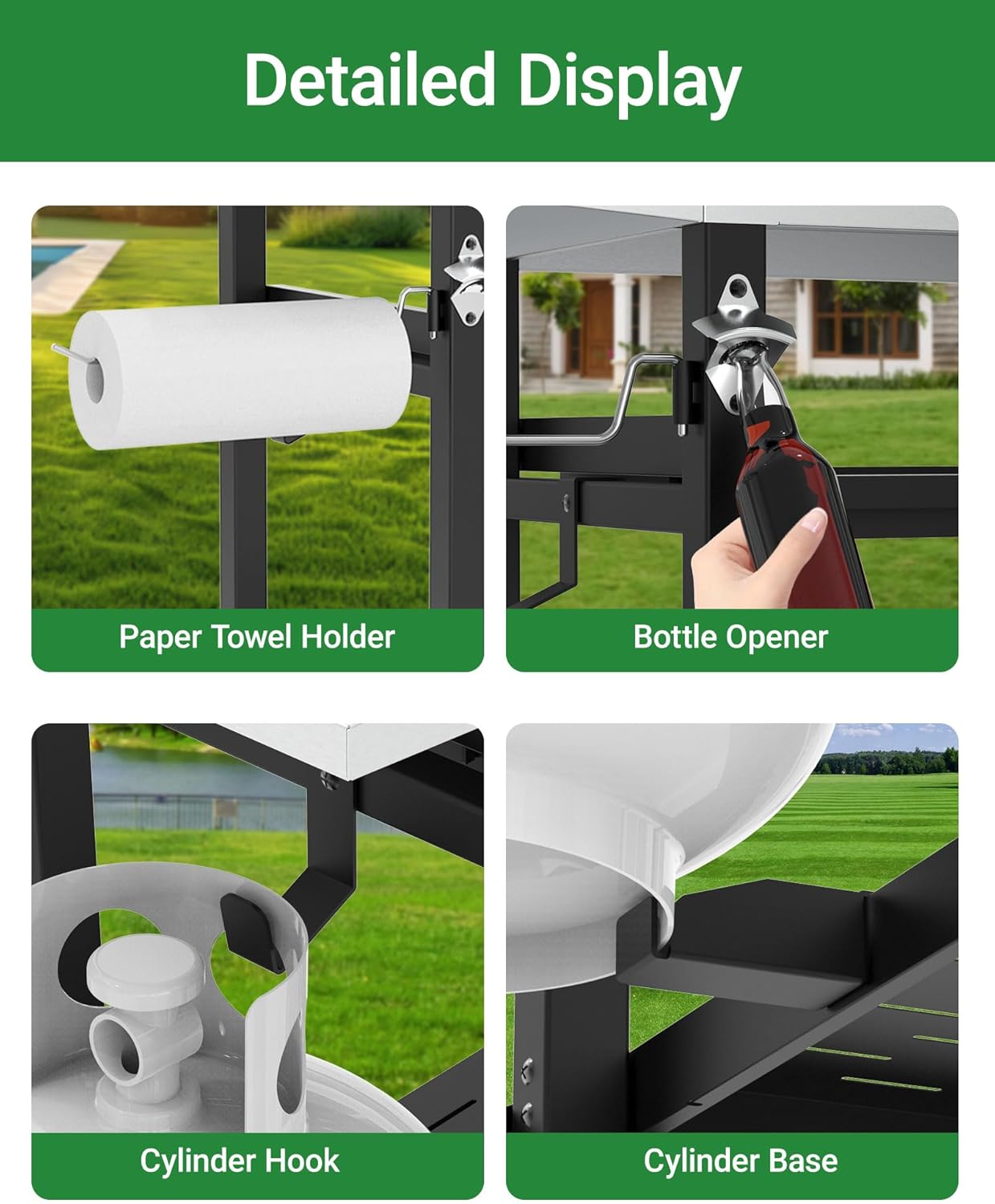 - Built-In Convenience Accessories: Enjoy added functionality with the propane tank holder, paper towel holder, and bottle opener on our outdoor grill table, making every BBQ hassle-free and fun!