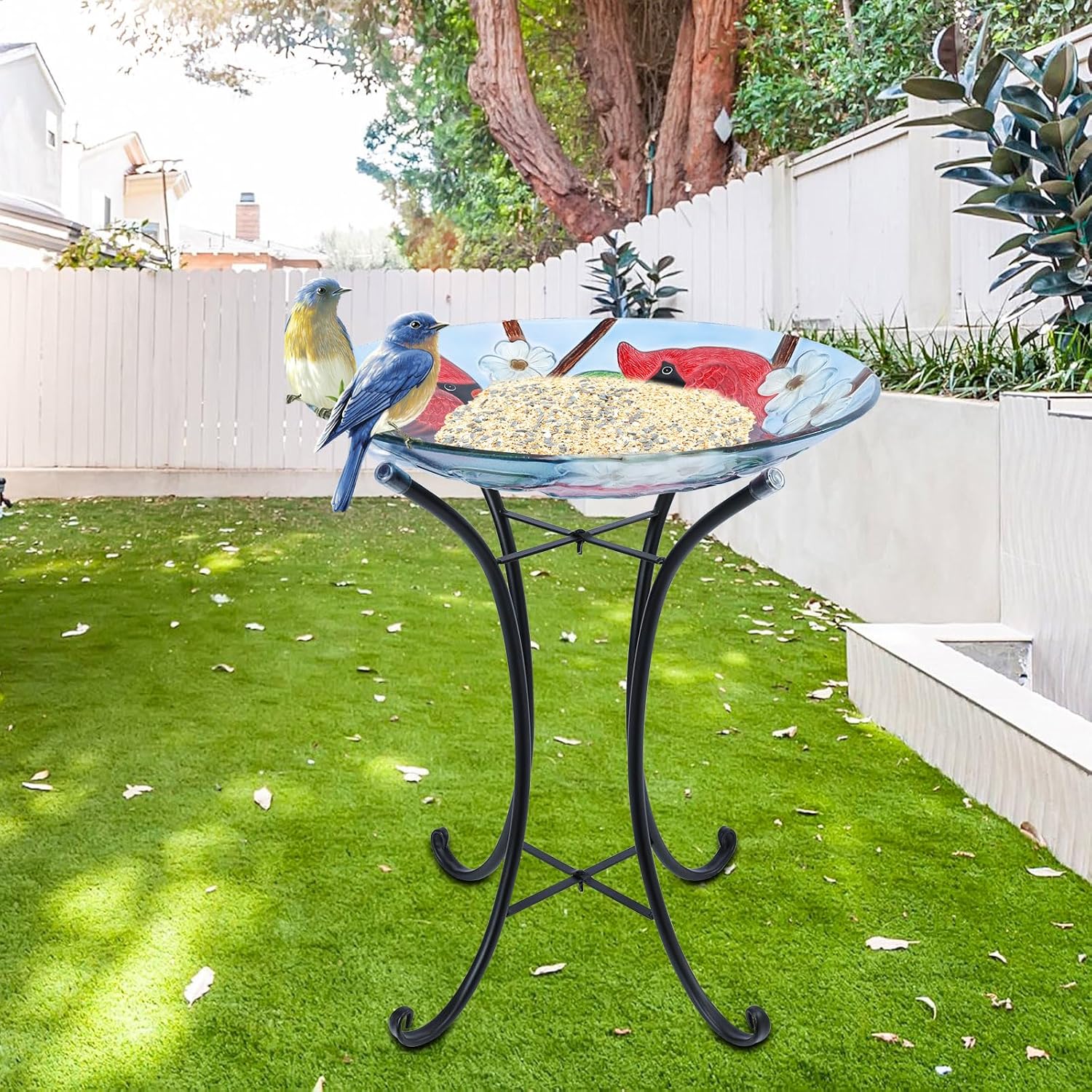 - Red cardinals bird bath has weather resistant, durable material and glass bird bath bowl is designed with Cardinal pattern, which is a gorgeous addition to any lawn garden yard outdoor space