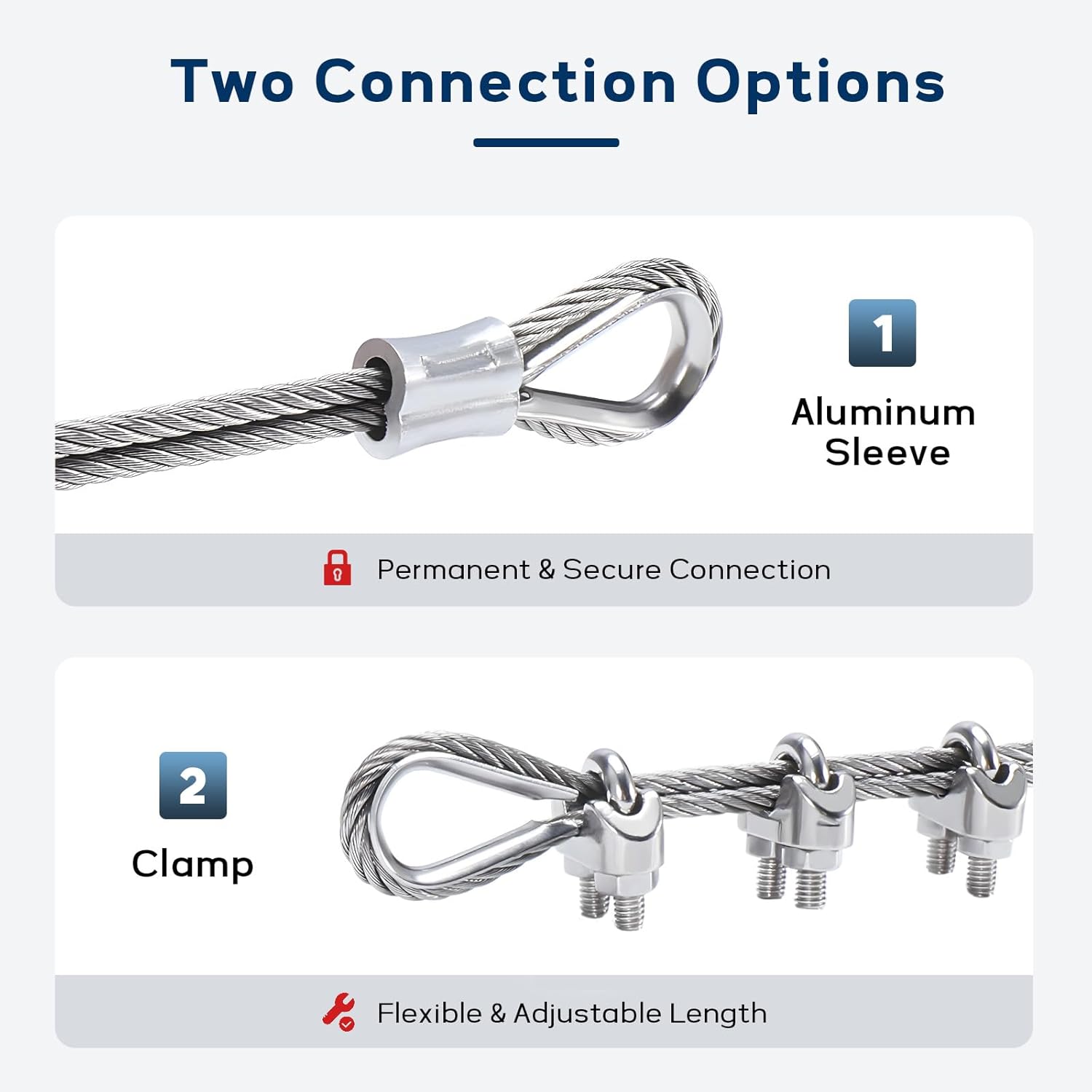 1/8 Inch Stainless Steel Cable 100FT, 7x19 Strand Wire Rope Kit with Thimbles, Clips & Aluminium Sleeves for Plants Climbing, Deck Fence Railing, String Light Haning and DIY Projects