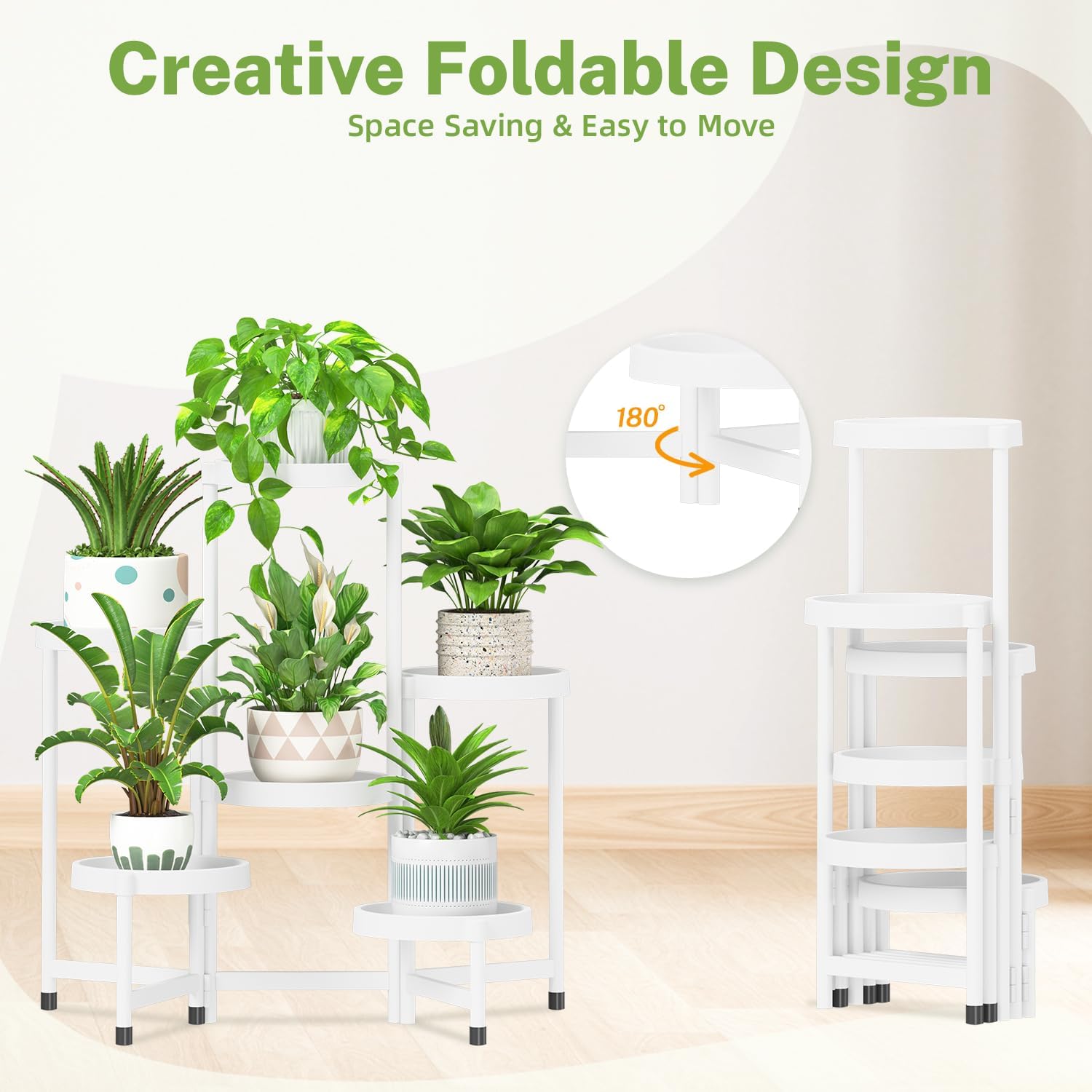 iDavosic.ly 6 Tier Folding Plant Stand Indoor Outdoor with Plastic Tray, Tiered Corner Flower Holder Shelf, Metal Orchid Display Rack for Patio Porch Living Room Garden Balcony, White