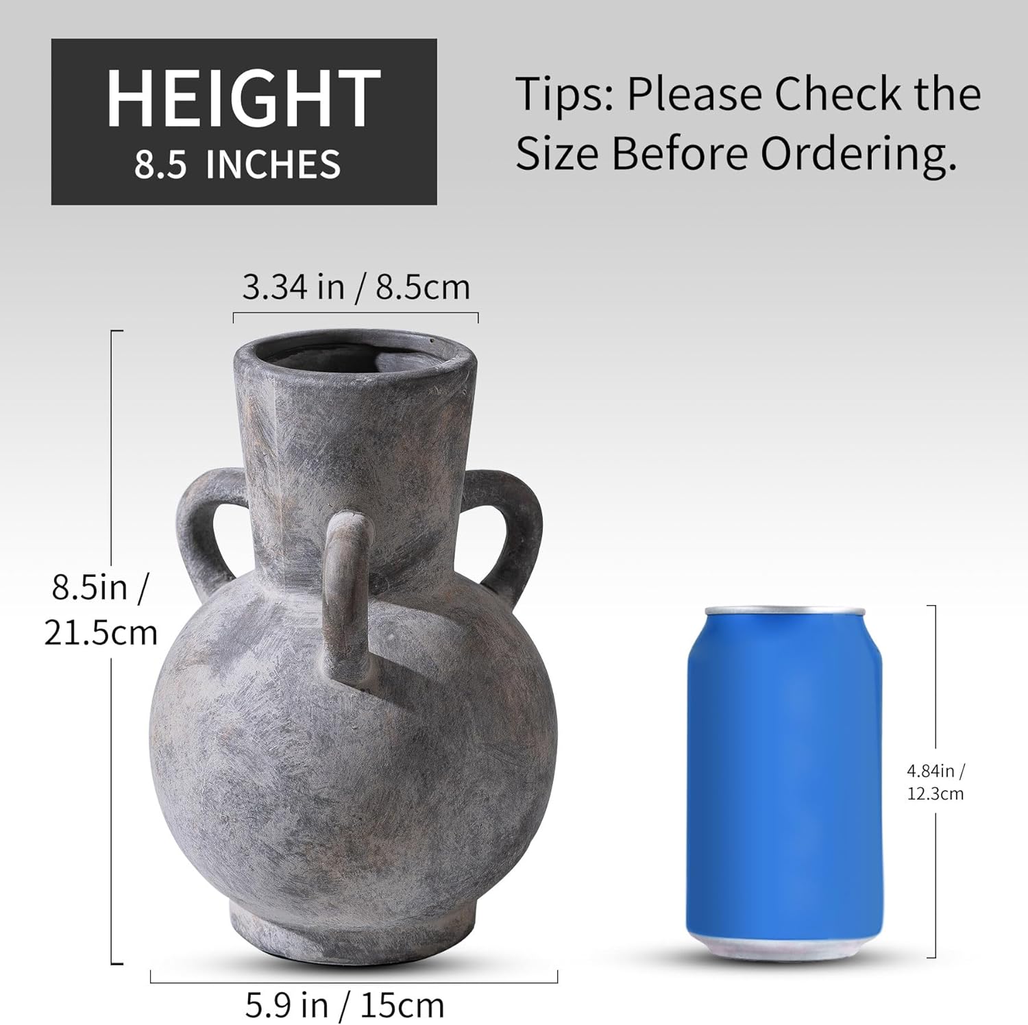 Rustic Grey Terracotta Ceramic Vase with Handles, Vintage Pottery Floral Vases, Cottage Core for Home Decor Table Centerpiece, Large Flower Vase for Bouquets Table Mantel Bedroon Bathroom 8.5 Inch