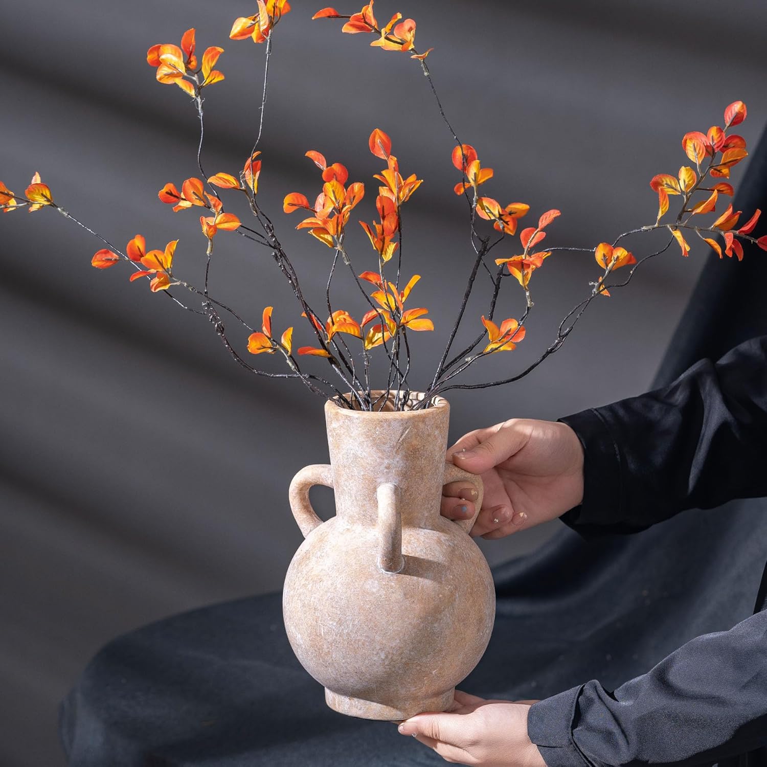 - Ergonomic Triple-Handle Design for Secure Stability: Designed for practicality, this durable pottery vase features three reinforced handles for easy lifting and placement as rustic table centerpieces or living room accents. The 3.35-inch wide mouth accommodates tulips, dried blooms, or standalone décor, while the textured finish and weighted flat base prevent slipping.
