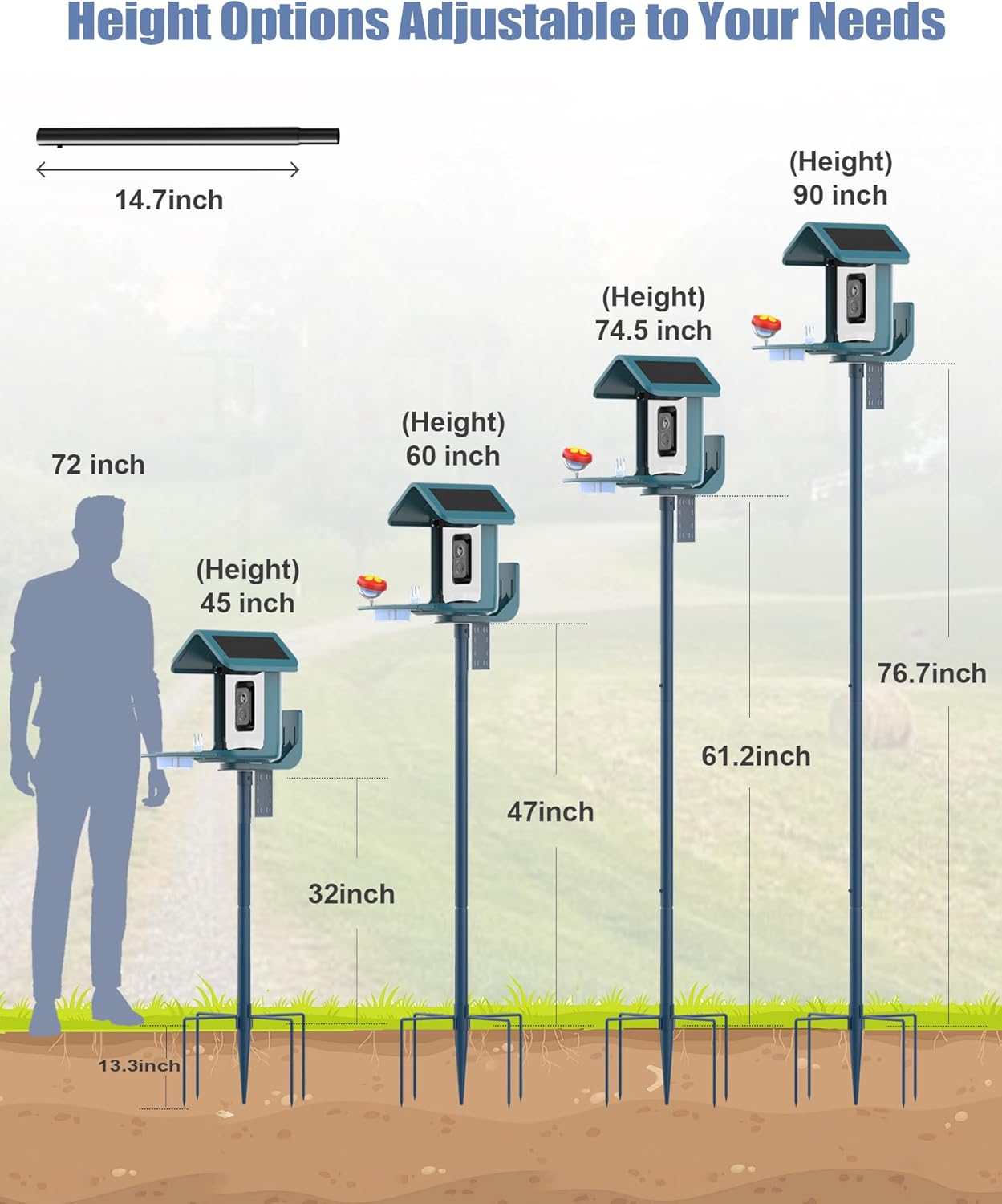 - 【Versatile Outdoor Use, Hang Multiple Items】Perfect for gardens, lawns, backyards, this bird feeder stand offers versatility for all your outdoor needs.You can hang bird feeder cameras, hummingbird feeders, bird houses and suet cage bird feeders outside. Whether decorating your space or creating a haven for birds, this pole stand offers flexibility and function for various outdoor settings.