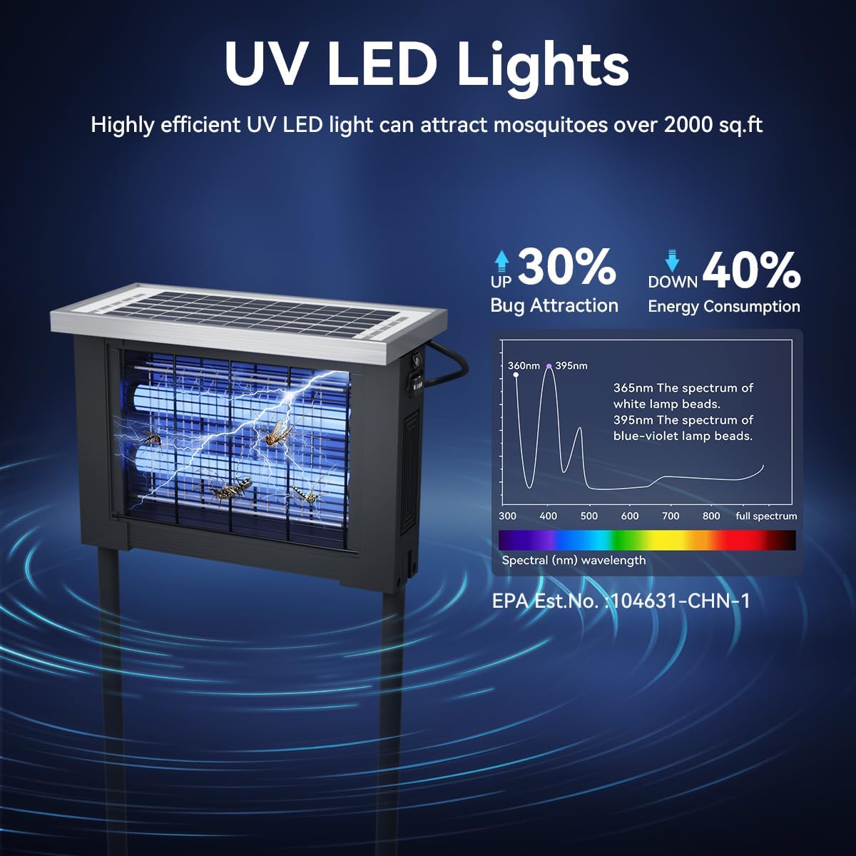 - PEAK EFFICIENCY: Engineered for backyard, the solar bug zapper outdoor waterproof attract insect with scientifically optimized light wavelengths that mosquito, fly, moth and wasp. Combined with an ultra-powerful 4500V grid, pests are instantly coked on contact. The solar mosquito zapper provides powerful coverage for areas up to 2100 sq.ft. No chemical attractants and pure light energy protect your family's yard play and enjoy the cool summer night.