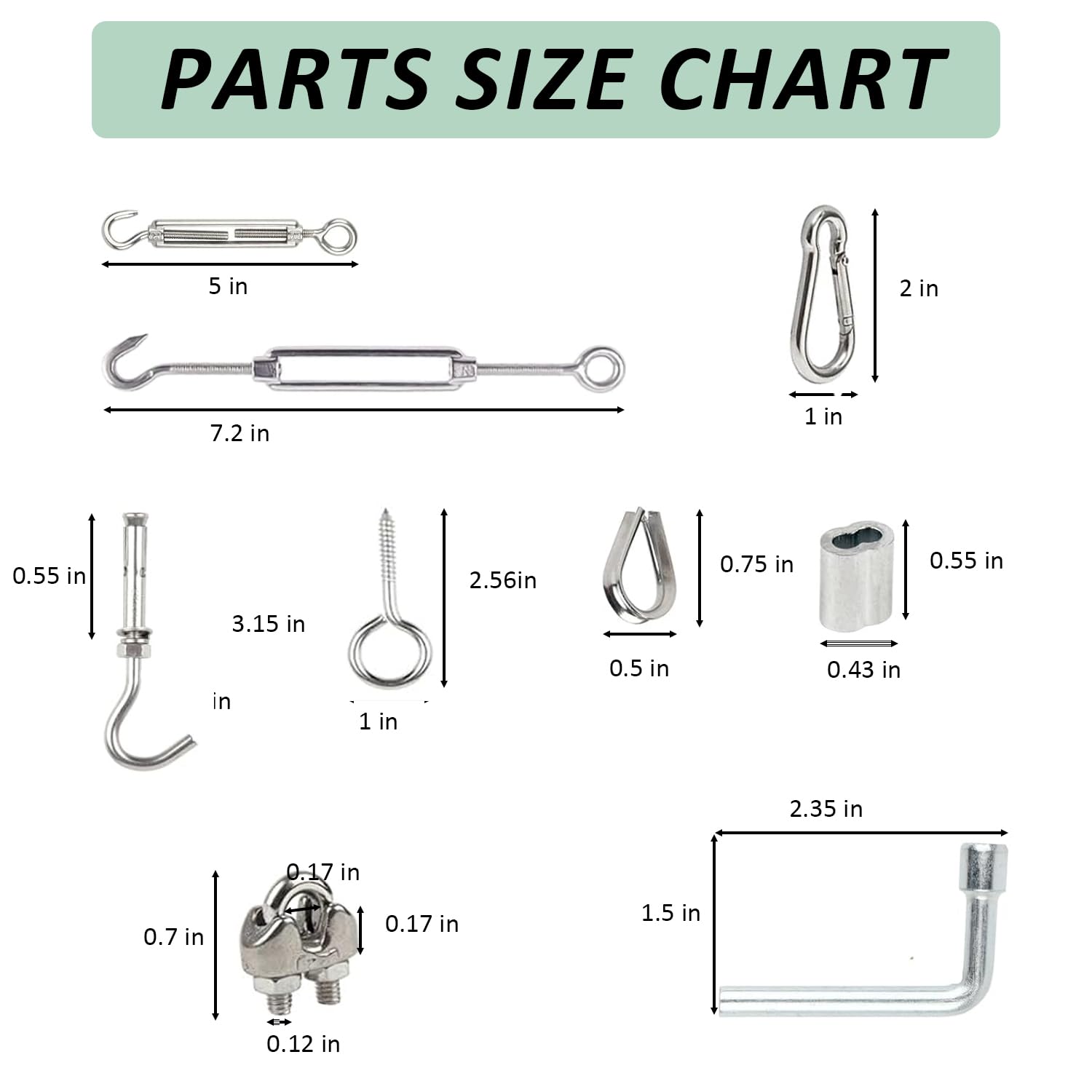- Package Included:Included 220FT 1/8" Vinyl Coated Stainless Steel Cable Wire,20PCS M3 thimble,20PCS M3 aluminum sleeve,10PCS M3 Wire Rope Cable Clip Clamp,4PCS M5 Turnbuckle Tensioners,2PCS M5 clips,10PCS M5 Sheep eye screw hook 65mm,10PCS M5 plastic anchors,2PCS M6 expansion hooks,1PCS Socket wrenches,1PCS Tape Measure,10PCS Black tent pegs Total 191PCS