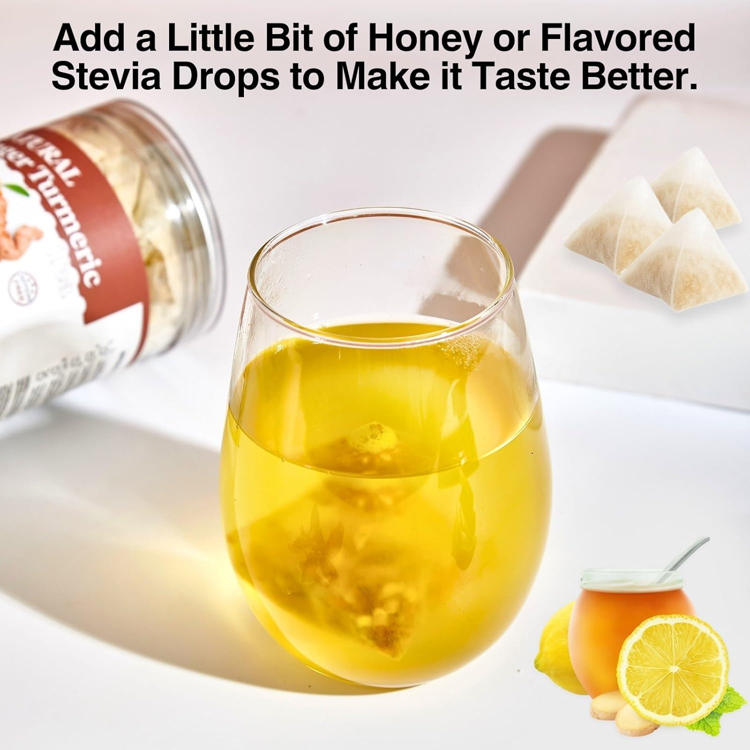 - [ Pyramid Tea Bags for Full Flavor ]: Ginger and turmeric tea bags, our biodegradable pyramid bags made of corn fiber, allow the herbs to expand and infuse more fully, delivering a rich and aromatic cup every time.